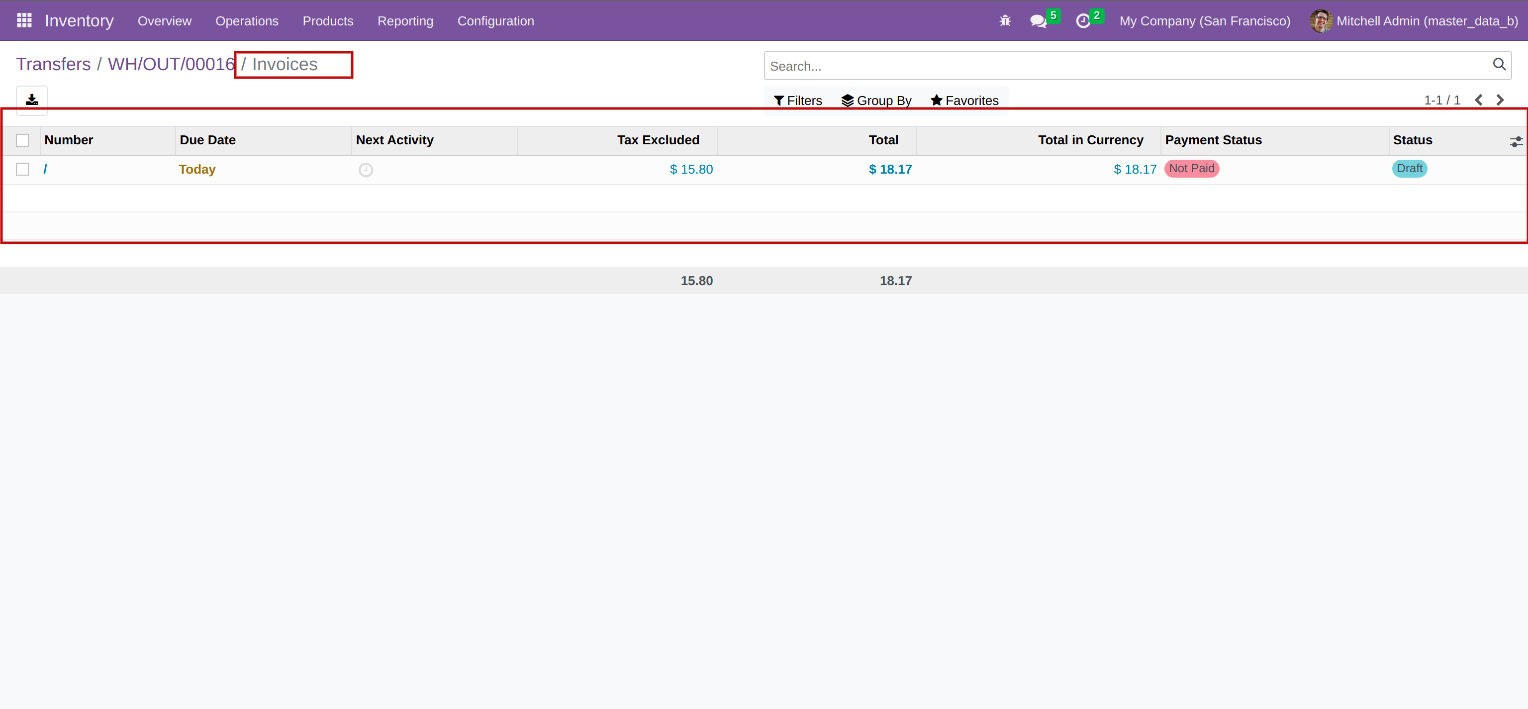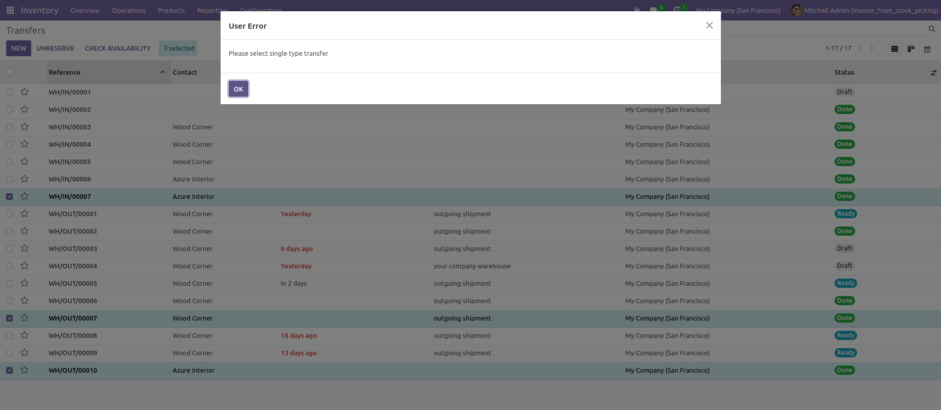 select multiple transfer with same transfer type and with different partner from the tree view. It will create a single invoice/bill for each transfer.