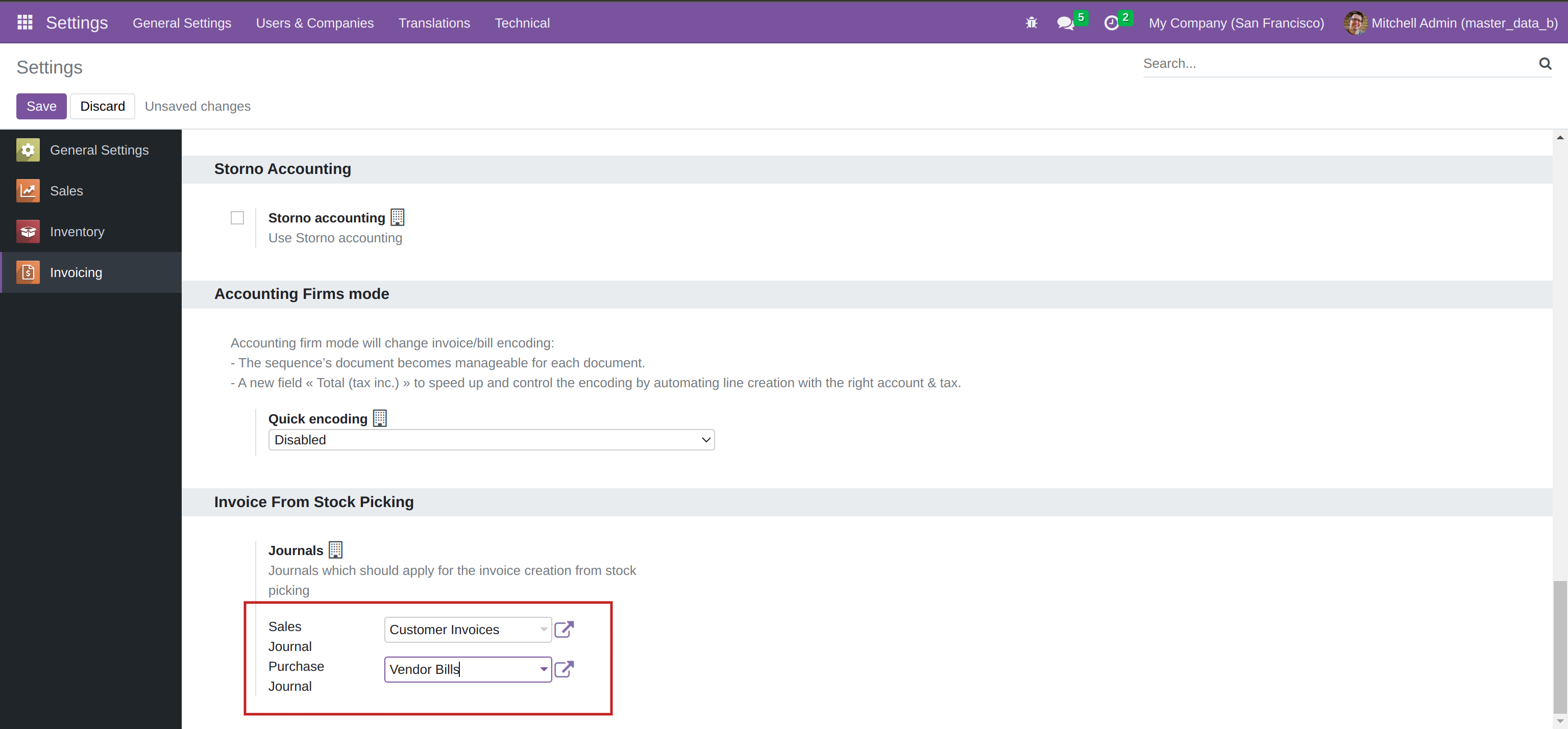 Configure the customer invoice & vendor bill journals from the settings