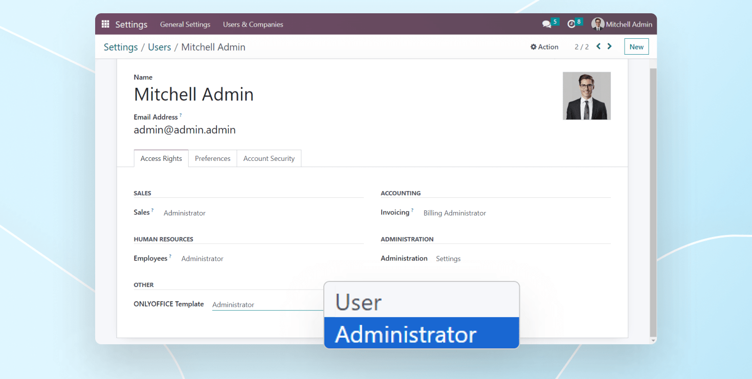 Work with fillable templates in Odoo using Euro-Office. Create templates based on the data and fields available in Odoo, fill them out and print with several clicks.